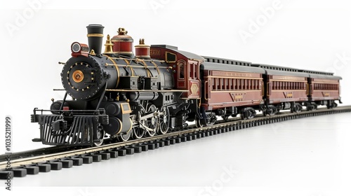 Naklejka premium A model of a steam locomotive with passenger cars on tracks, set against a white background