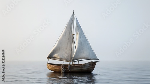 © Devian Art, Fototapeta premium A model sailboat with white sails peacefully floats on a gray background