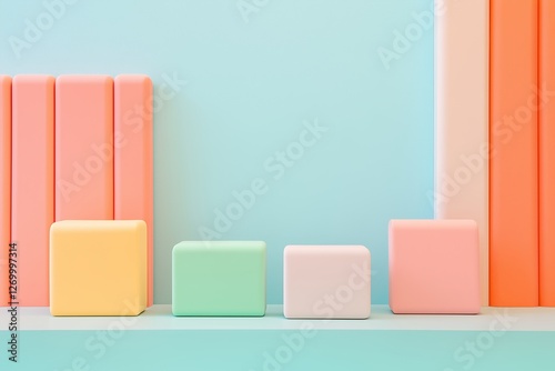 Obraz premium A modern abstract arrangement featuring pastel-colored geometric shapes against a multicolored background.