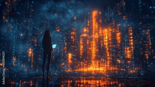 Fototapeta premium A modern AI robot standing in front of a digital cityscape, analyzing urban...