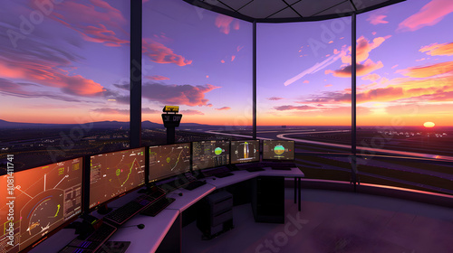 Fototapeta premium A modern air traffic control tower at sunset, showcasing technology and...