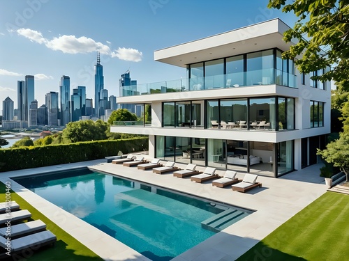 Fototapeta premium A modern and luxurious real estate property with a sleek design, large windows, spacious rooms, high ceilings, a beautiful garden with a swimming pool, and a stunning view of the city skyline