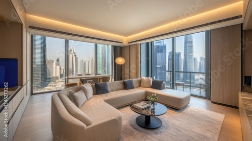 © Pannee, Obraz premium A modern apartment living room showcasing an L-shaped sofa in an optimally spaced setting