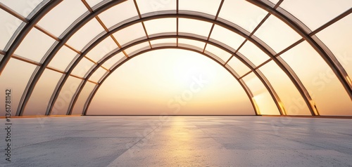 Obraz premium A modern architectural structure with an arched glass design, bathed in warm sunlight, creating a serene and spacious atmosphere.