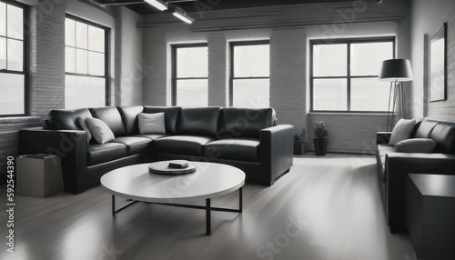 Fototapeta premium A modern architecture. A living room with a large sofa and modern furniture in shades of gray. Generative AI