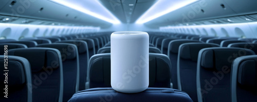 © Wimon, Fototapeta premium A modern audio device sits prominently on a passenger seat in an empty airplane cabin, showcasing a blend of technology and travel.