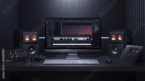 © AURA COLLECTIONS, Obraz premium A modern audio production setup featuring a computer, speakers, and mixing equipment.