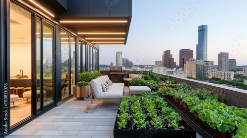 Fototapeta premium A modern balcony garden with lush greenery, stylish seating, and a city...