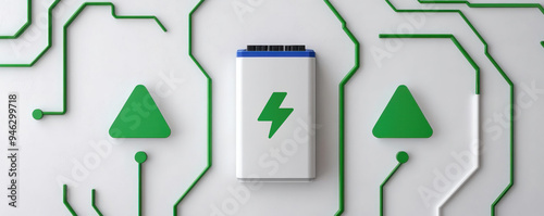 © Tanakorn, Obraz premium A modern battery design with charging symbol on circuit board background, representing energy technology and innovation.