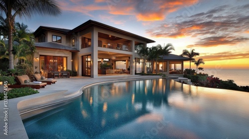 © Sawat, Obraz premium A modern beachfront home with a sleek infinity-edge pool, palm trees, and a sunset ocean backdrop.