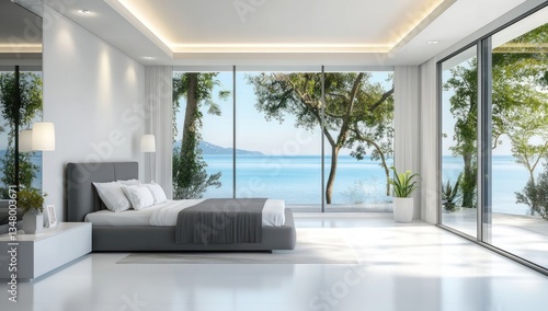 Fototapeta premium A modern bedroom with a large window overlooking the ocean view