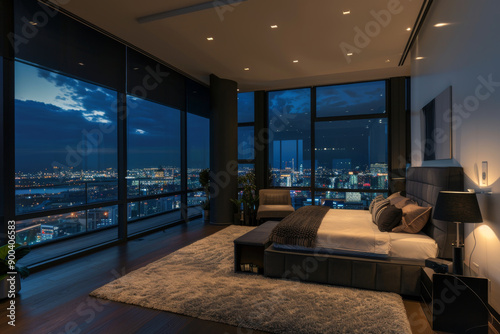 Naklejka premium A modern bedroom with a panoramic view of a city at night showcasing a luxurious and inviting atmosphere