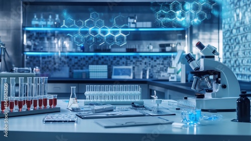 Fototapeta premium A modern biotech workspace with sleek scientific tools, test tubes, and...