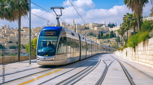 © Oksana, Fototapeta premium A modern blue line tram moves through the streets of Jerusalem, surrounded by historic buildings and palm trees under a bright sky
