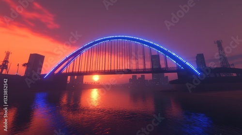 © Biancaart, Fototapeta premium A modern blue lit bridge spans a river during sunset