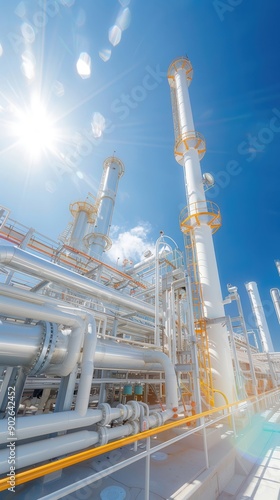 Obraz premium A modern brewery with tall, gleaming equipment under bright blue sky,...