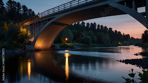 Naklejka premium A modern bridge crossing a quiet river at dusk