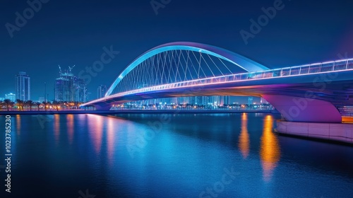 © Zidan, Fototapeta premium A modern bridge illuminated with blue and pink lights at night, reflecting in the calm water of a canal with the city skyline in the background.