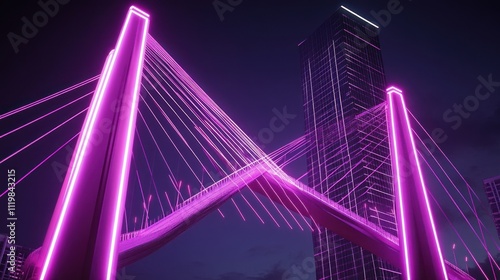 © isti, Obraz premium A modern bridge illuminated with pink lights, set against a dark city skyline.