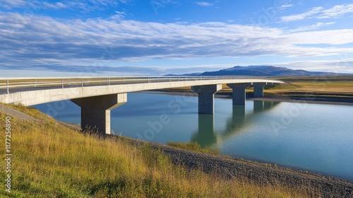 © yoga, Fototapeta premium A modern bridge spans a tranquil river under a blue sky, surrounded by lush landscapes.