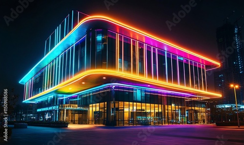 © EFA, Obraz premium A modern building illuminated with vibrant neon lights at night.