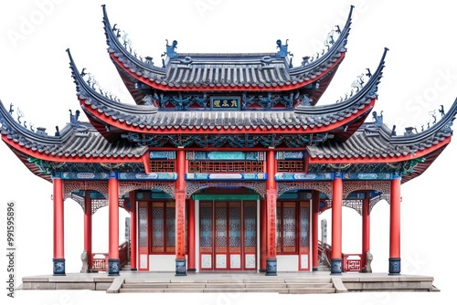 © Fotograf, Fototapeta premium A modern building with a red roof and blue walls