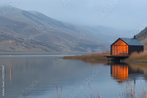 Fototapeta premium A modern cabin sits on a lake, illuminated by warm light as dusk settles over...