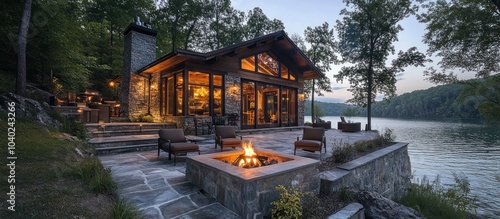© Almahyra, Obraz premium A modern cabin with a stone fireplace and patio overlooking a lake.