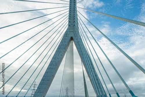 Obraz premium A modern cable-stayed bridge against a cloudy sky showcasing its...