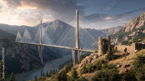 © Hnf, Obraz premium A modern cable-stayed bridge spans a deep canyon, set amidst rugged mountains and an ancient stone fortress, under a sunset sky