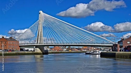 © DYDY_COLLECTIONS, Fototapeta premium A modern cable-stayed bridge spans a river under a clear blue sky with fluffy clouds.