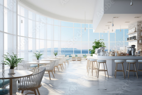 Fototapeta premium a modern cafe interior design, with wide windows, sea view