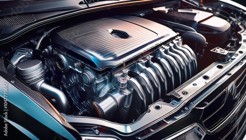 © homydesign, Obraz premium A modern car engine with a sleek black cover and silver stripes