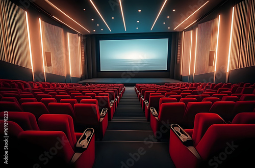 © Daniel, Obraz premium a modern cinema hall with red seats and a large screen