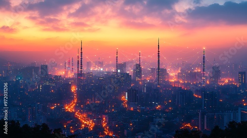 Fototapeta premium A modern city at dusk, where illuminated data streams visibly connect wireless towers and smart homes. The skyline glows in rich sunset colors,