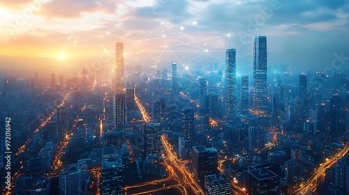 Fototapeta premium A modern city seen from above, glowing with interconnected communication...