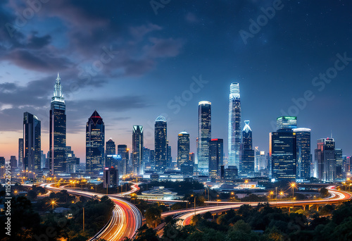 Naklejka premium A modern city skyline at night with tall skyscrapers and illuminated highways...