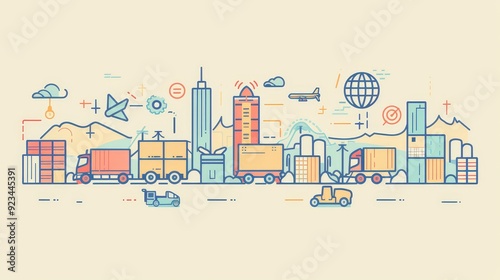 Fototapeta premium A modern city skyline with trucks, cargo containers, and airplanes,...