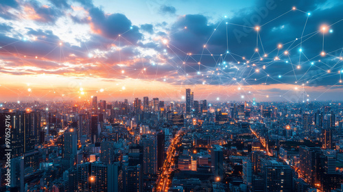 Fototapeta premium A modern city using technology to improve. Bright lights shine over the city at night. Fast 5G internet and fiber optic cables connect everything.