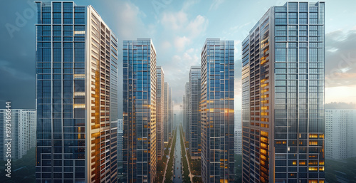 © visoot, Obraz premium A modern cityscape featuring a cluster of high-end apartment buildings. The buildings tall and sleek, with multiple floors, a contemporary design with clean lines and sophisticated finishes.