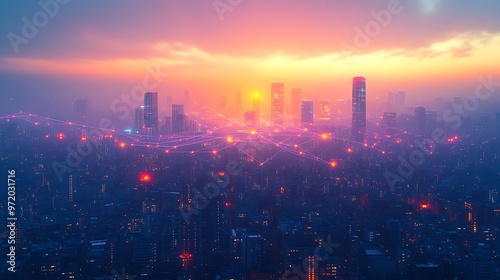 Fototapeta premium A modern cityscape illuminated by visible data streams flowing between homes,...