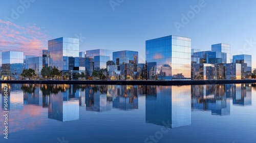 Fototapeta premium A modern cityscape of towering glass buildings glows across tranquil water, creating a vision of advanced technology and sleek urban style.