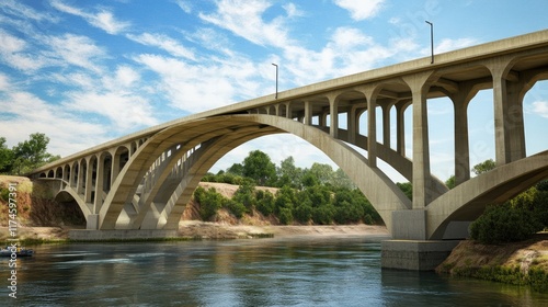 Fototapeta premium A modern concrete bridge spanning a river, surrounded by greenery and blue...