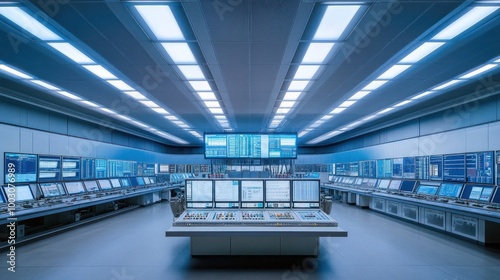 Naklejka premium A modern control room with multiple screens and control panels for monitoring systems.