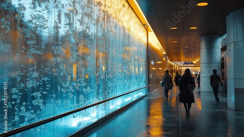 © gentho, Obraz premium A modern corridor with a decorative water wall and people walking through a well-lit space.