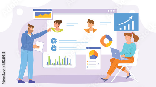 © doo, Obraz premium A modern, 2D vector illustration showcasing the concept of business insights and growth analytics. The design features a sleek dashboard with graphs, charts, and data visualizations in vibrant colors.