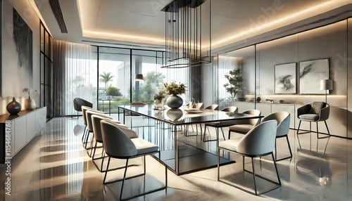 © Sem, Fototapeta premium A modern dining space with a glass table, sleek chairs, and soft lighting