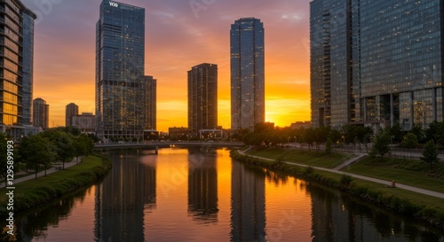 © Sabir Shah, Obraz premium A modern downtown skyline at sunset, glass skyscrapers reflecting warm golden light