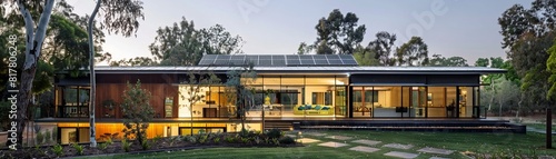 Obraz premium A modern ecohouse with solar technology, embracing nature s embrace for a...