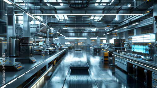 Fototapeta premium A modern electronics manufacturing plant with automated assembly lines, testing stations, and quality control systems, momentarily still but ready to produce a wide range of electronic devices